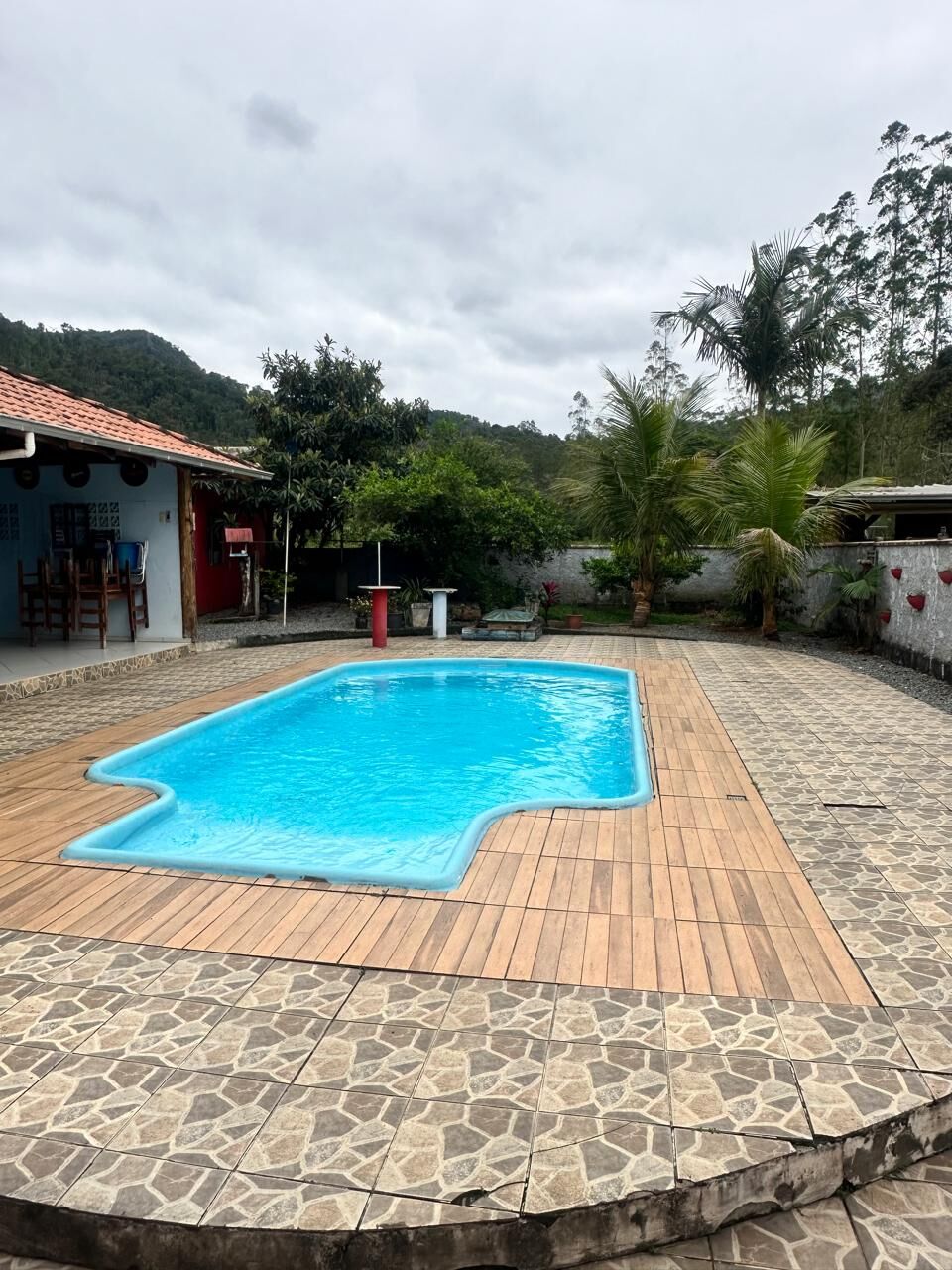 Quintal: jardim e piscina.